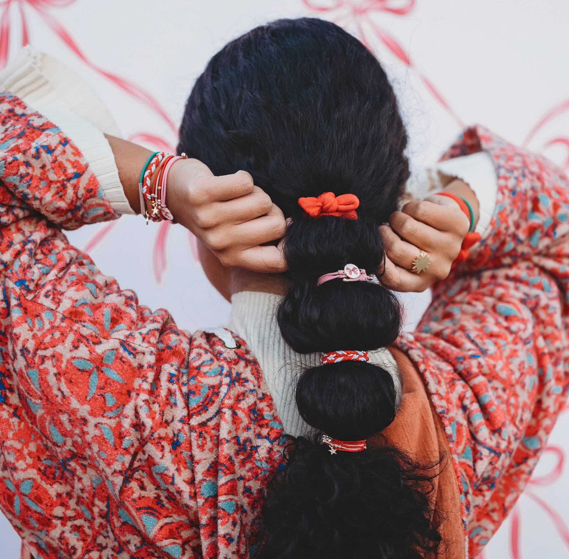 Introducing Joy – the perfect holiday hair tie bracelet! With festive colors and a subtle sparkle, Joy seamlessly transitions from wrist to hair, adding a touch of holiday magic to your style. Whether you're dressing up for a seasonal celebration or keeping it casual, Joy brings both charm and function to any outfit. Looking for a fun stocking stuffer? Joy makes a great gift, blending practicality with a festive feel. Spread the joy this season by gifting one (or a few) to friends and loved ones! Medium is the size of a normal hair tie band. It fits wrists between 5-6.4" around. Small is better for younger girls and small teens. It fits wrists under 5" around.