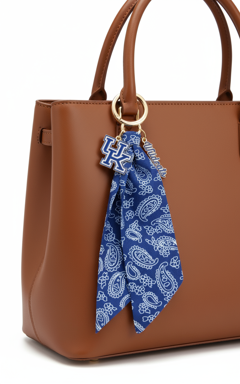 Show off your team pride wherever you go with this University of Kentucky Bandana Keychain! Featuring a bold blue paisley bandana, gold keyring, and two spirited charms — the iconic UK logo and “Wildcats” tag — this keychain adds the perfect touch of Kentucky flair to your keys, purse, or game day bag.