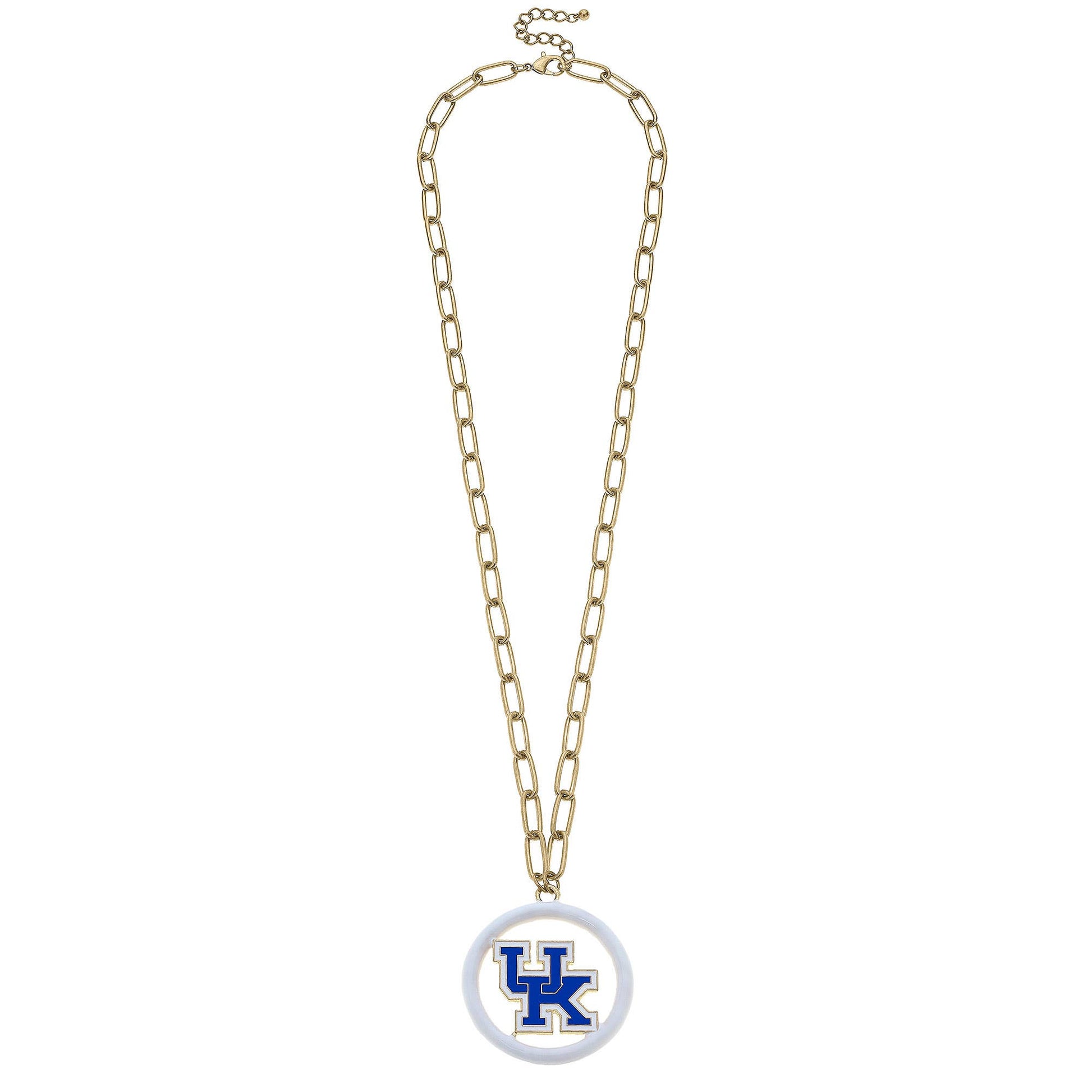 Show off your school spirit with our Kentucky Wildcats Enamel Medallion Necklace! Perfect for making a statement, this necklace features the University of Kentucky logo. DETAILS: * Base Metal with Worn Gold Plating * Enamel Material * 32" Length *