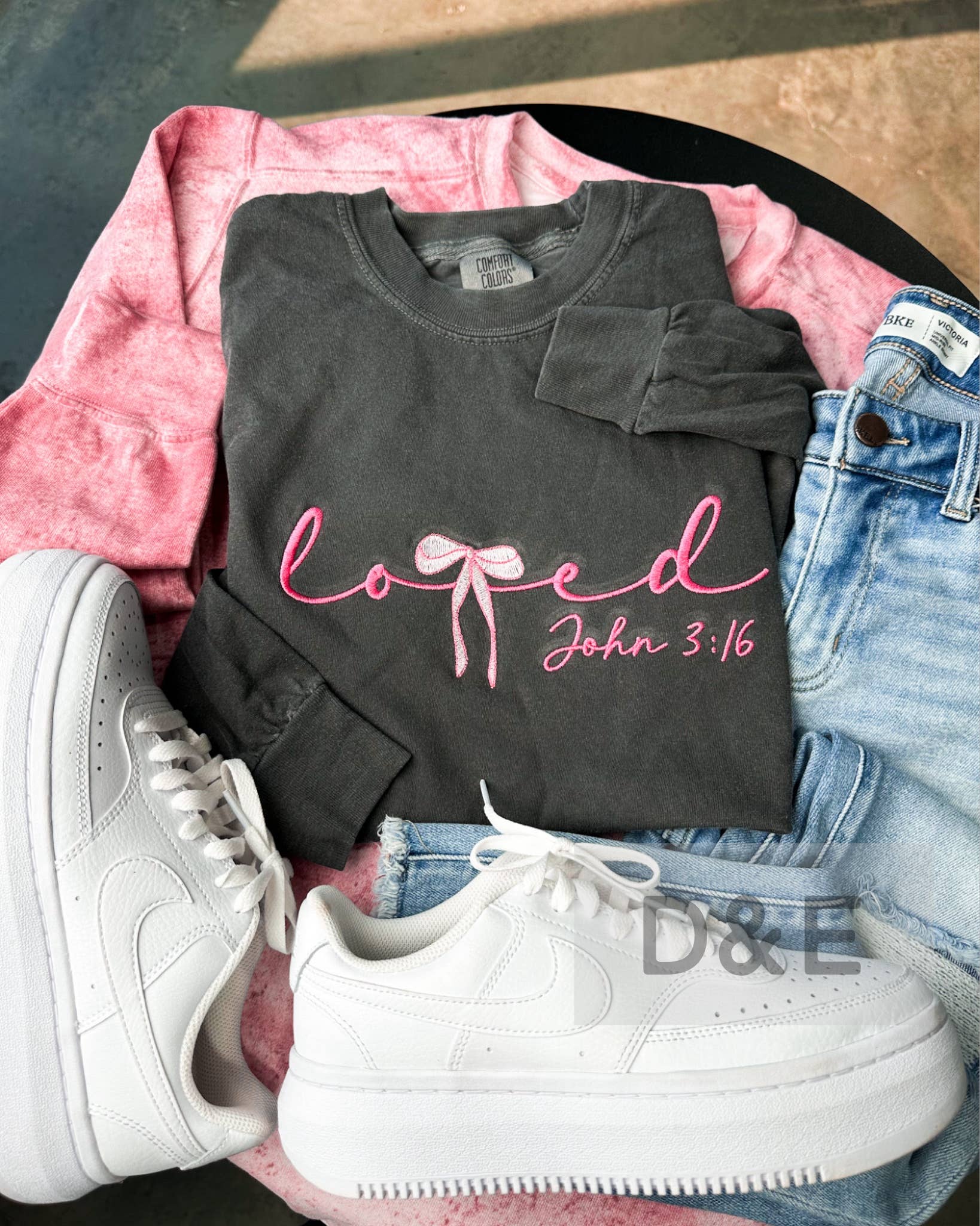 Loved with a bow embroidered in pink thread on a long-sleeved comfort colors tee. Unisex fit.