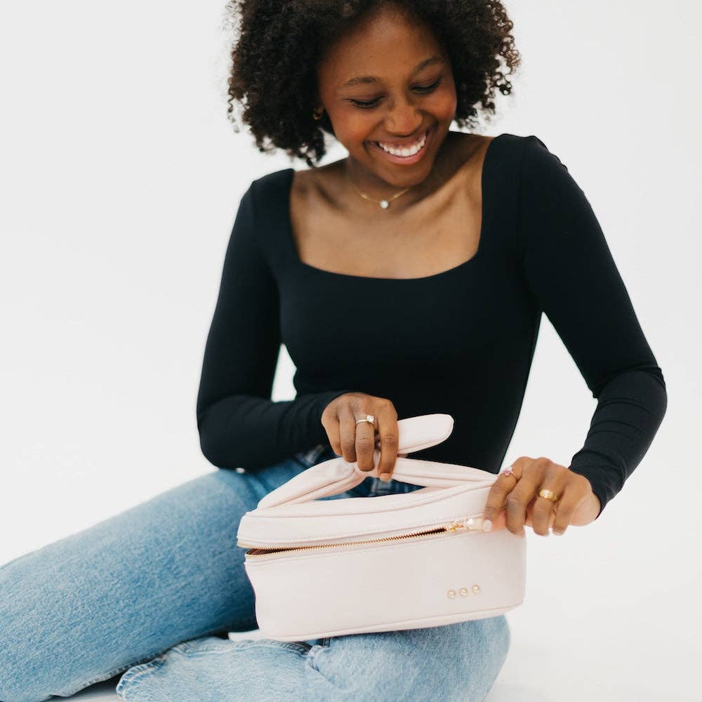 Introducing your new BFF - our Madelyn Bow Makeup Bag! Available in 4 chic colors, this makeup bag has plenty of room for all your beauty products, hair essentials, and more. Plus, there's a zipper pocket with a compact mirror for on-the-go touch-ups. Perfect for stylish travelers and it's easy to clean too!