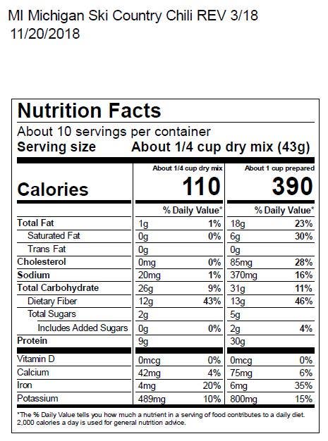 Inspired by crisp winters and cozy cabins in northern Michigan, Michigan Ski Country Chili is our homage to snowy days and hearty, stick-to-your-ribs meals. This bean-based chili mix blends classic chili seasonings with a whole japones pepper to add gentle warmth and depth—perfect after a day on the trails or just a chilly night at home. Made with only clean, shelf-stable dry ingredients, this family-sized recipe is ideal for making ahead or storing in your pantry for a no-fuss, satisfying meal. Just add ground beef and a bit of smoky bacon for a true comfort food classic that serves a crowd. Whether you're fresh off the slopes or just dreaming of a winter getaway, this chili brings that rustic Michigan magic into your kitchen—one bowl at a time. Nutrition: Clean Label, Nothing Artificial, No Added Salt, Gluten Free, Non-GMO, Vegan Friendly. Serves: 20 Cook time: 2 Hours Heat: Mild Size: 15.0 oz.