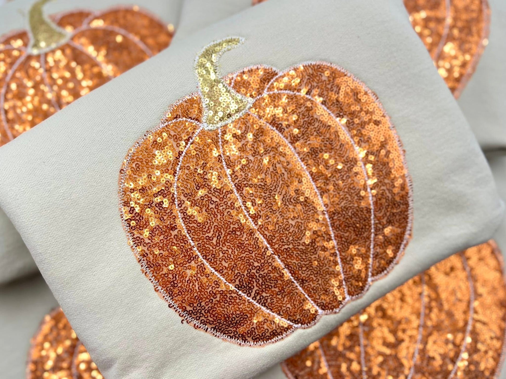 Shine bright this fall in our Sequin Pumpkin Sweatshirt! This cozy cream pullover features a stunning pumpkin design made entirely of shimmering sequins — catching the light beautifully for that perfect autumn sparkle. Embroidered on a sand gilden sweatshirt!