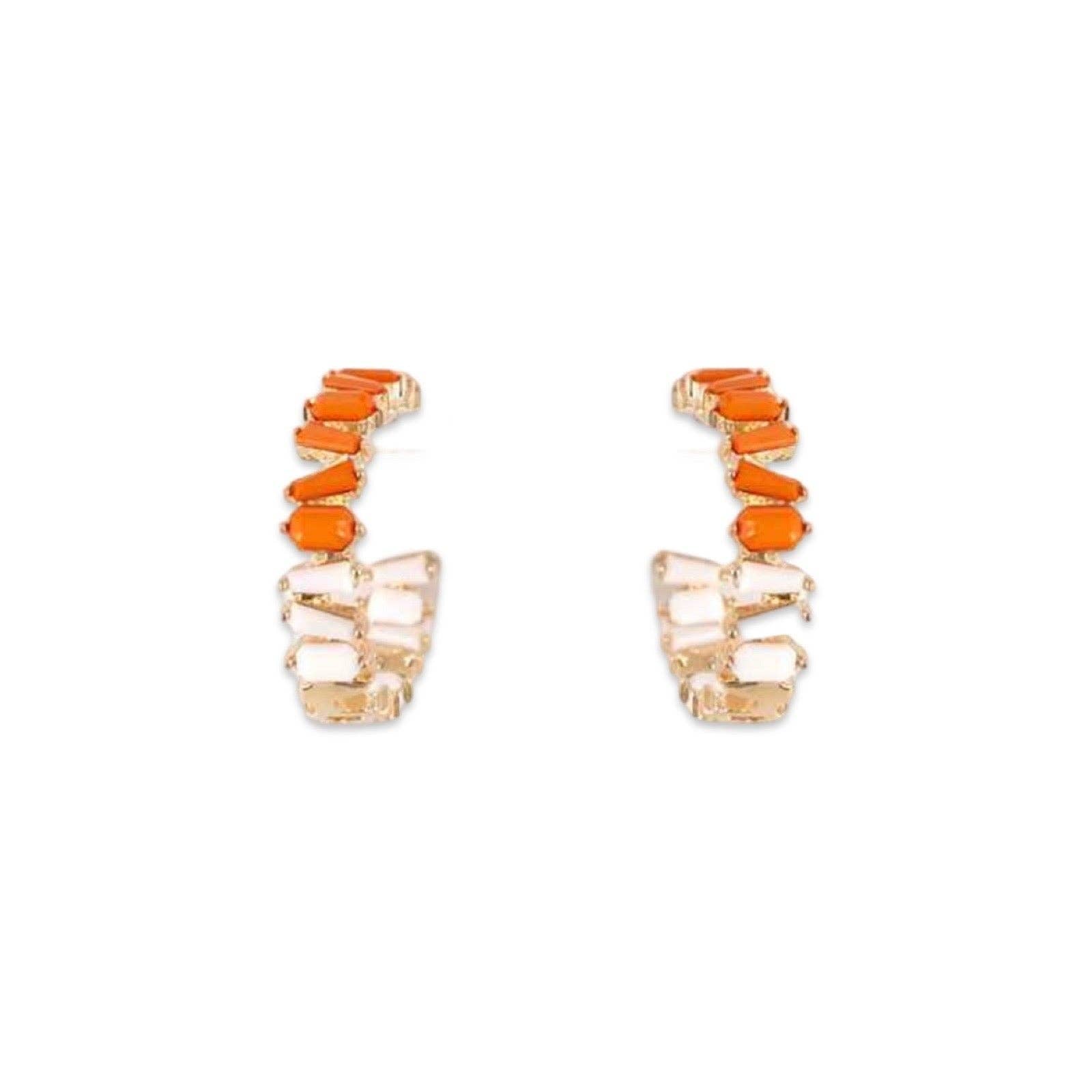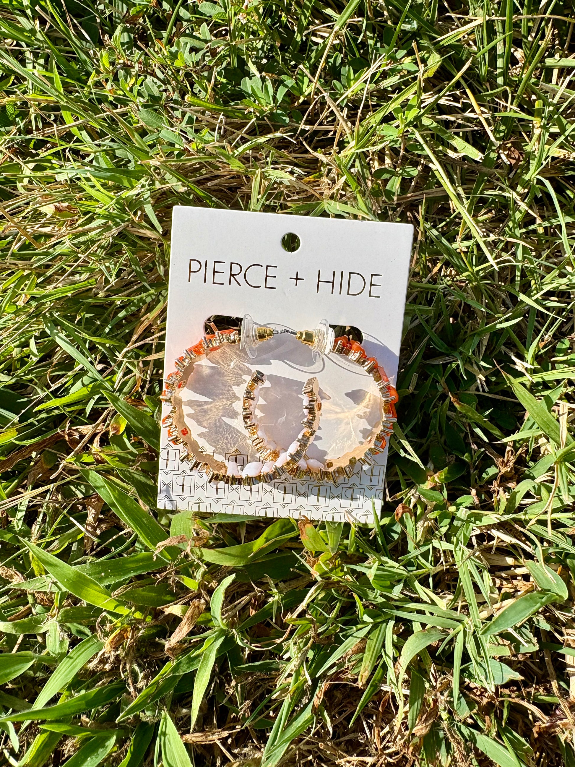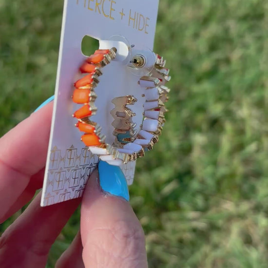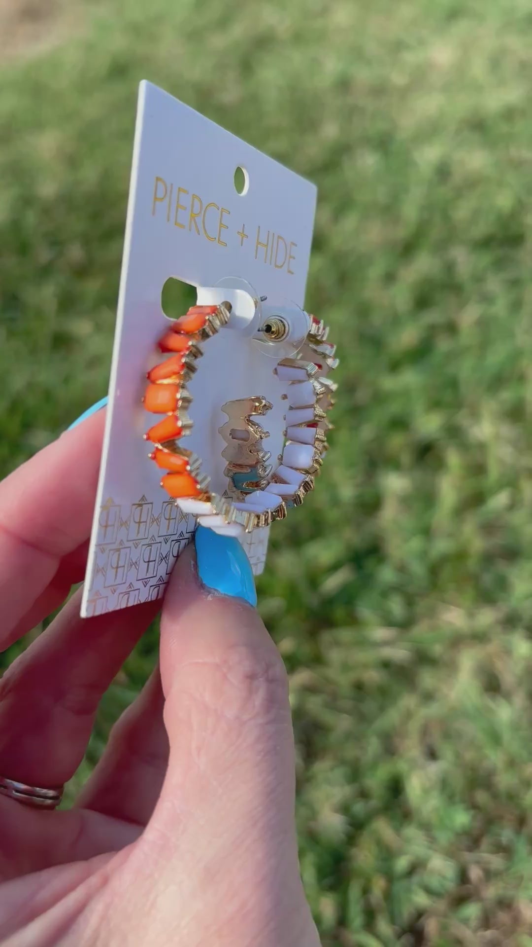 Because Earrings Always Fit! Cheer on your favorite team in style with our Orange + White Game Day Hoops — a bold, color block accessory perfect for tailgating, back-to-school season, sorority events, and game days. These lightweight acrylic hoops with gold accents are an easy, go-to statement piece.