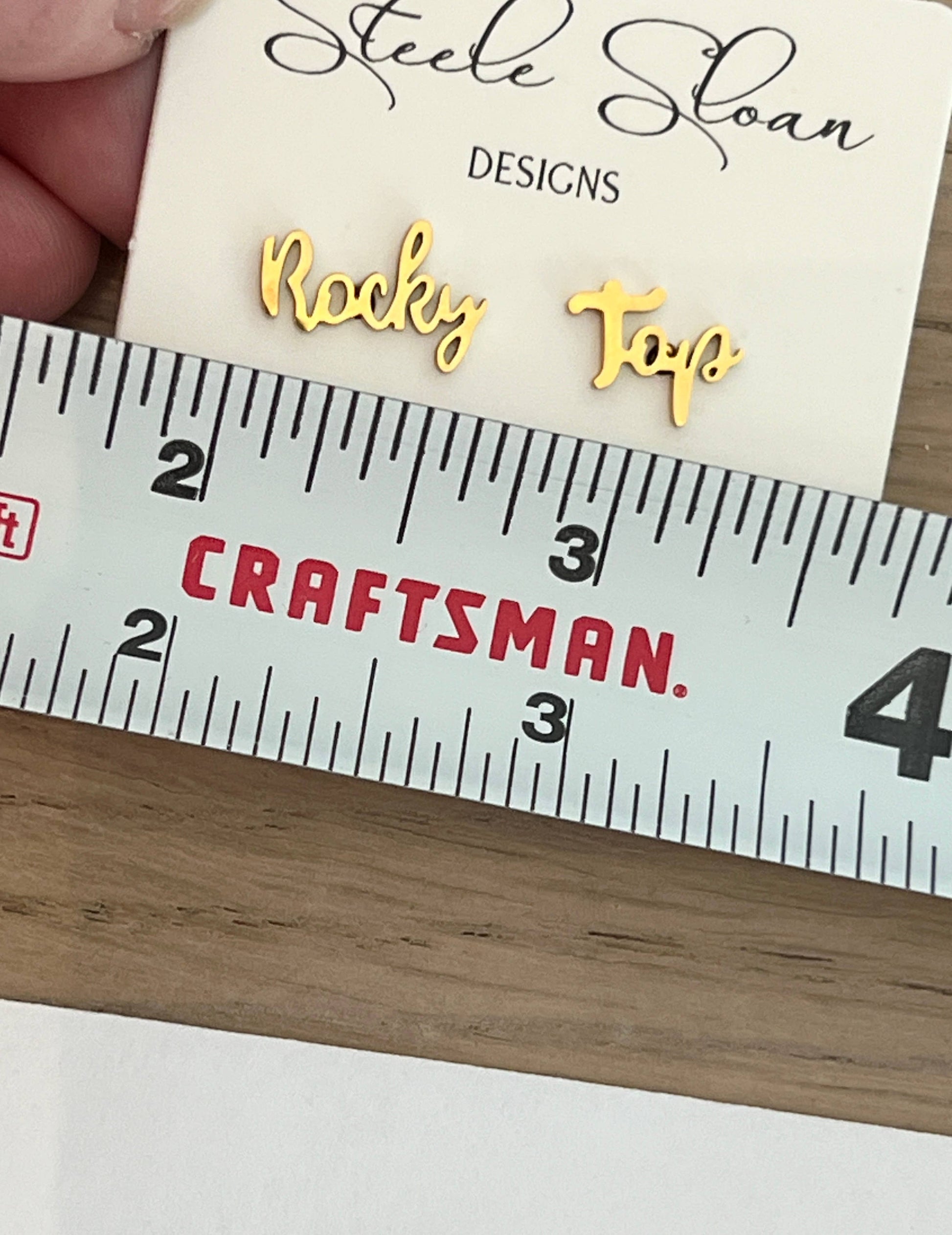 Good Ole Rocky Top! Let's go VOLS! Material: Hypoallergenic Stainless-Steel Color: Gold Size: just at 1/2-inch, Top just under 1/2 inch Officially Licensed Product