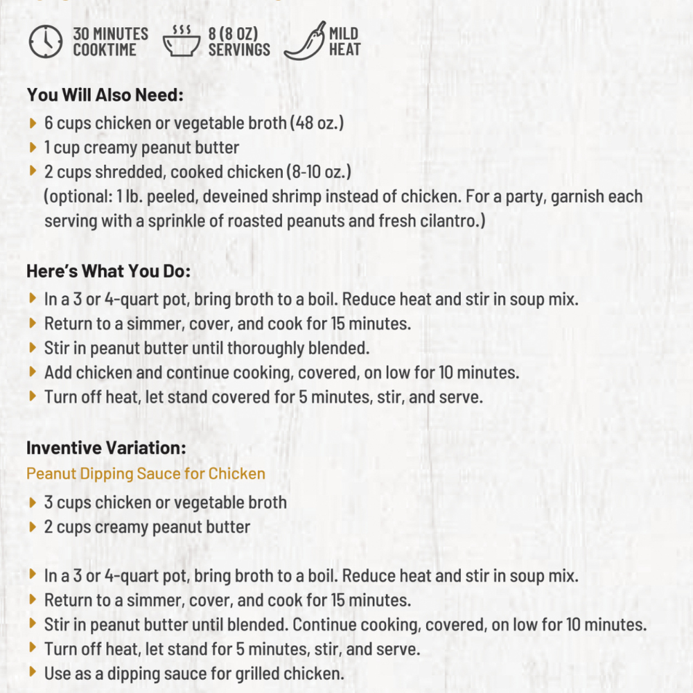 Our Thai Style Golden Peanut Soup brings the cozy, comforting flavors of Southeast Asia right to your home kitchen. Crafted from a dry blend of vibrant spices, rice, and aromatic vegetables, this soup is the perfect balance of savory, nutty, and gently spicy. Despite the name, this mix contains no peanuts—you add your favorite peanut butter at home to give it that rich, creamy depth we all love in Thai cuisine. Stir in cooked chicken or tofu for a hearty meal, or serve it as a unique appetizer that’s ready in just 30 minutes. Inspired by the cozy bowls of street-side cafés in Chiang Mai and Bangkok, this soup brings a golden glow and globally inspired comfort to your everyday table—no passport required. Nutrition: Clean Label, Nothing Artificial, No Added Salt, Gluten Free, Non-GMO, Vegan Friendly. Allergen: Contains no peanuts. Serves: 8 Cook time: 30 Minutes Heat: Mild Size: 4.25 oz.